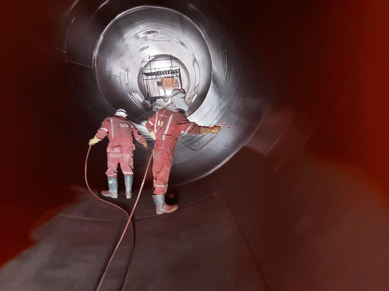 Completed penstock coating works including scaffolding supply and protective coating application at hydropower facility.